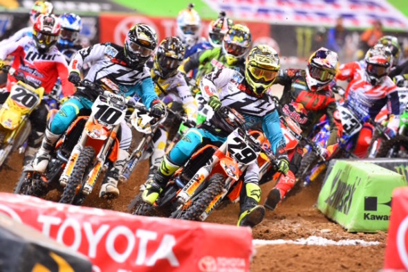 BTOSports.com/KTM’s Andrew Short opened the 450SX Class Main Event with the Holeshot Award but was quickly passed by Dungey before being ejected from his bike. The crash forced Short to exit the race.