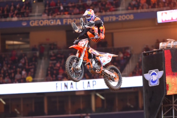 For the sixth time this season, Red Bull KTM‘s Ryan Dungey was victorious en route to winning the Monster Energy AMA Supercross, an FIM World Championship, race at the Edward Jones Dome in front of 58,552 fans. Red Bull KTM’s Marvin Musquin won his fifth Eastern Regional 250SX Class race, leading all 15 laps of the Main Event. Tonight was the fifth time this season that the Red Bull KTM team swept both classes.