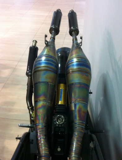 The bike, or one like it, had to physically be in the shop—you can’t make closely-fitted pipes without the bike. One of my three-cylinder customers had bought and crashed on three sets of made-on-a-jig drag-o-pipes that had acted as sidestands in corners. Building pipes on the bike allows you to make the dimples and other accommodations that bring the pipes up and in as far as they can be.